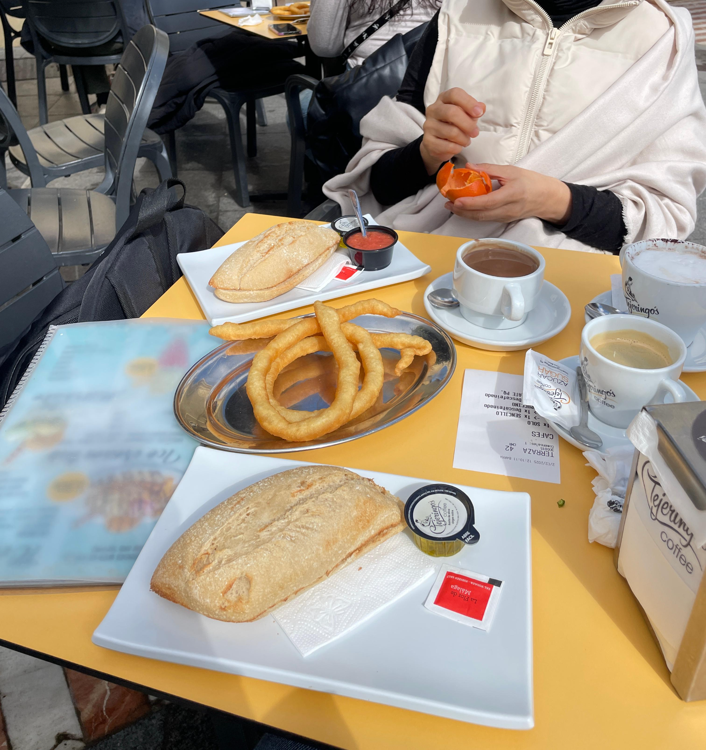 카푸치노 1잔, 아메리카노 1잔, Pitufo (작은 사이즈)로 빤꼰또마떼와 그냥 올리브유로 2개, 그리고 추로스는 2 Unidades 그리고 찍어먹을 초콜라떼를 시켰다.