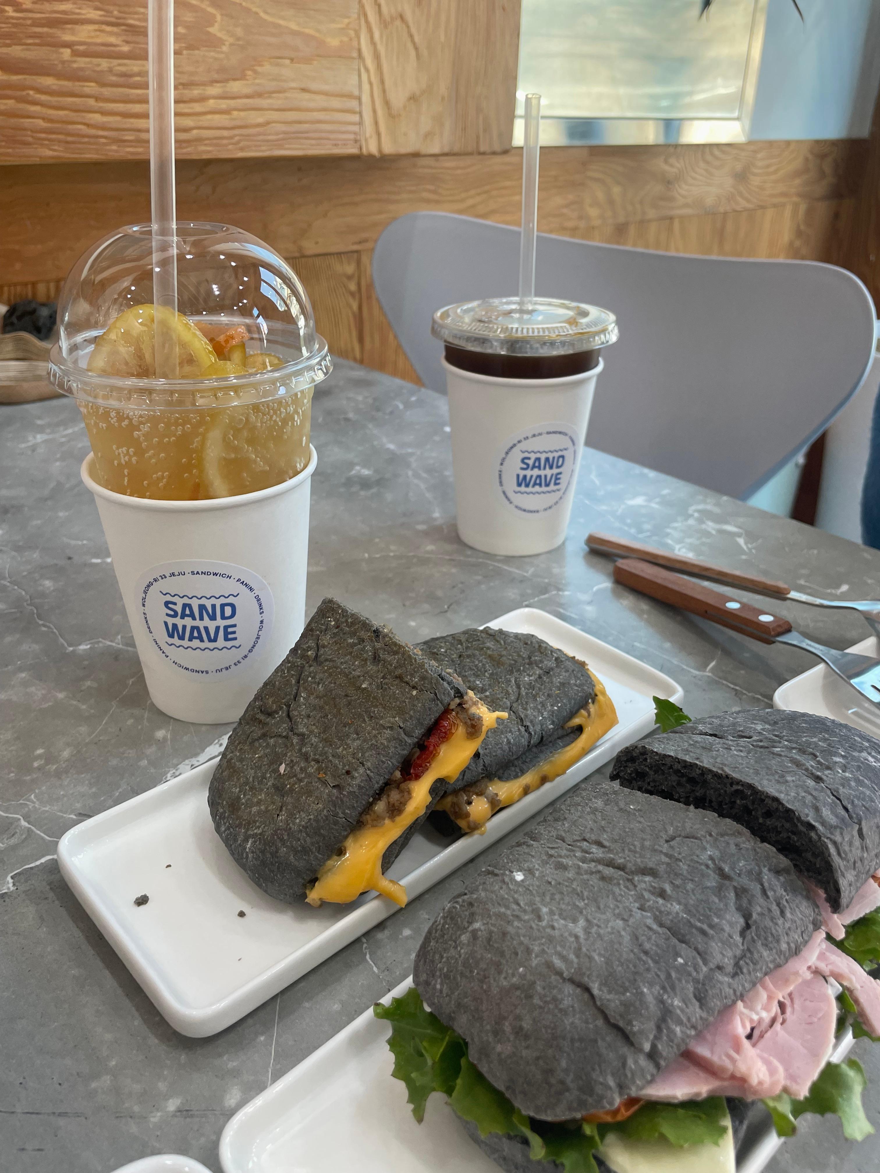 해수욕장에서 서핑을 한참 즐긴 후 살짝 출출할 때 먹기 딱인 흑돼지 잠봉 먹물 파니니